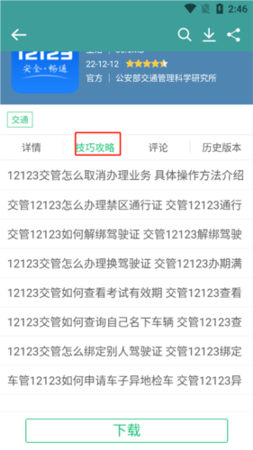 4、详情页包含应用介绍、官方信息、使用攻略、用户评论及历史版本等;用户可查阅攻略解决疑问,最后点击下载按钮安装到手机。