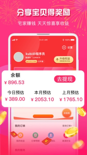 与天猫、京东、拼多多等一线电商平台商家合作,随时随地为用户提供购物、休闲娱乐及生活服务等领域的隐藏优惠券,实现“巨享优惠超省钱、分享赚钱”。