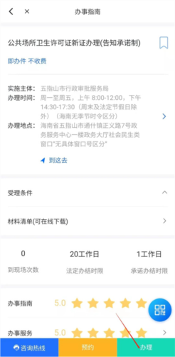 3、从结果中找到需要办理的事项,点击进入办事指南页面查看具体要求;如需在线申报,则点击右下角“办理”按钮。