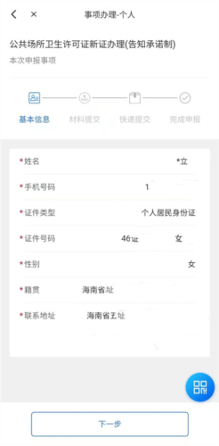 4、按照页面提示逐步填写个人或企业基本信息,完成后点击下一步。