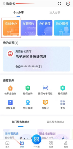 1、打开海易办ios版本,登录已完成实名的个人或法人账号;在页面下方选择“办事”入口,切换左上角地址,选取个人办事或法人办事,点击“在线申办”。