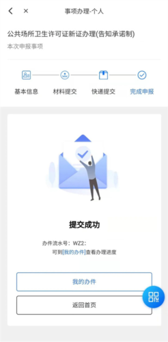 7、至此办件已成功提交;用户可在APP首页点击“办事”,进入个人或法人办事页面,选择“办件进度”下的“办理中”查看当前进度。