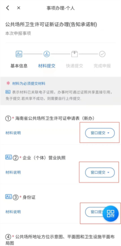 5、提交相关材料;系统支持拍照、照片图库、电子证照库、电子材料库及窗口提交共五种方式;考虑到手机设备差异与归档要求,建议优先选用电子证照库、电子材料库或窗口提交。