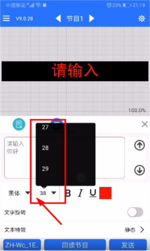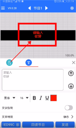 6、编辑好的内容会在屏幕上方预览;确认无误后,点击发送按钮即可将节目传至LED屏幕显示。