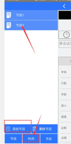 3、点击界面左侧的箭头进入【节目】管理页,选择【添加节目】;在新节目中点击【时间】设置选项。