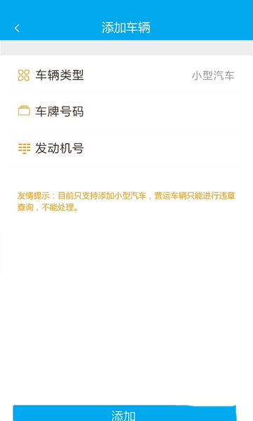 1、下载安装软件后,点击添加车辆,选择车型并输入车牌号码;
