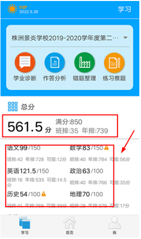 进入【学习】页面即可查看成绩;页面上方的【学业诊断】、【作答分析】与【错题整理】提供更多功能。