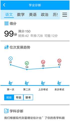 点击【学业诊断】,系统将分析学习优势与不足,帮助学生实现成绩的突破与提升。