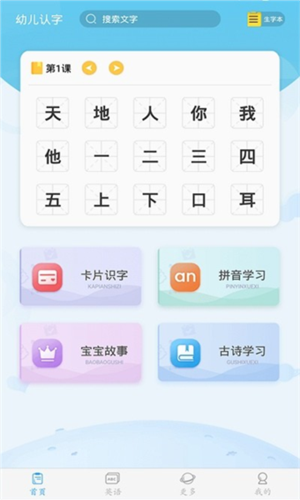 1、启动幼儿认字app,可以看到首页、英语、更多和我的四个主要板块,点击首页内容即可开始学习。
