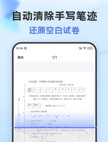 自动清除试卷上的手写笔迹,恢复题目原始面貌;
