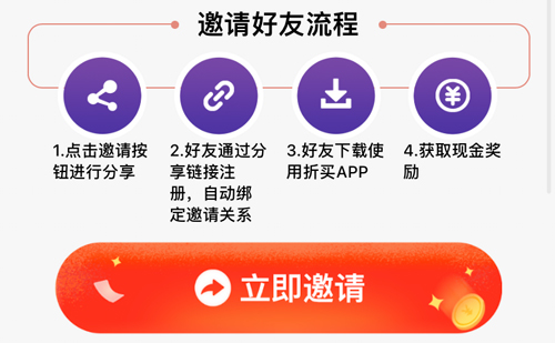 打开折买返利官方版,在首页中部可以看到“邀请好友”入口,点击进入后会出现“立即邀请”按钮。将该页面分享给朋友,对方通过你的链接完成注册与下载,即可建立邀请关系。具体步骤如下: