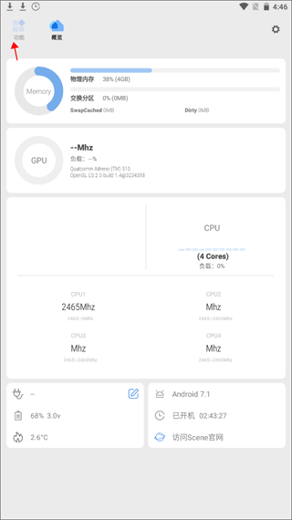 进入首页后,可直观查看内存使用、系统进程、CPU占用及各核心状态等多种手机数据。
