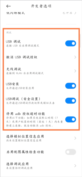 返回后进入更多设置与开发者选项,启用USB调试、USB安装、USB调试安全设置并停用adb授权超时功能。