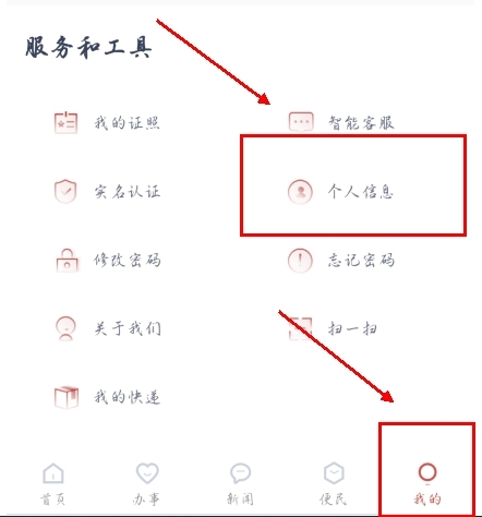 1、操作较为简单,同样在【我的】页面的服务与工具里,找到【个人信息】入口并点击。