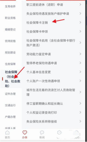 4、在办事页面中,找到社保保障相关分类,点击进入【社会保障卡注销】服务。