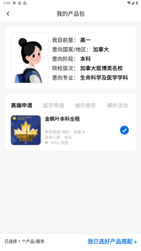 4、【产品页面】:为用户展示各类高端定制留学服务项目与课程产品,可根据需求进行详细了解与选择。