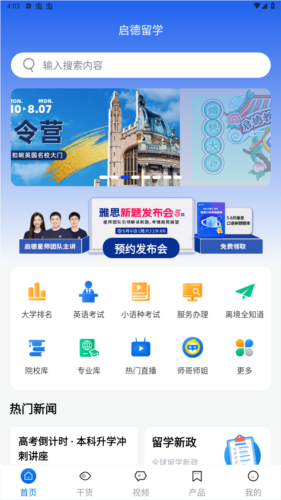1、【首页页面】:此页面聚合了应用的核心内容,展示主要功能入口、热门资讯、精选留学服务推荐以及积分活动等。