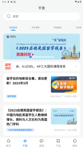 2、【干货页面】:提供国内外与留学相关的政策新闻、行业白皮书及深度分析文章,帮助用户持续了解留学领域动态。