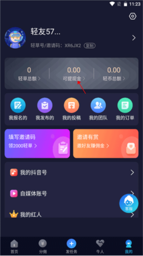 1、打开软件后,点击“我的”页面中的“可提现金”选项。
