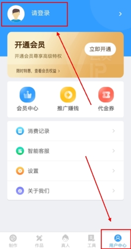 首先进入应用内用户中心页面,点击页面上方的请登录入口。