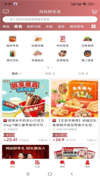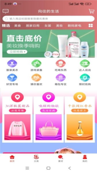 1、在app首页可以浏览精选推送的商品,也能按分类查找所需物品;