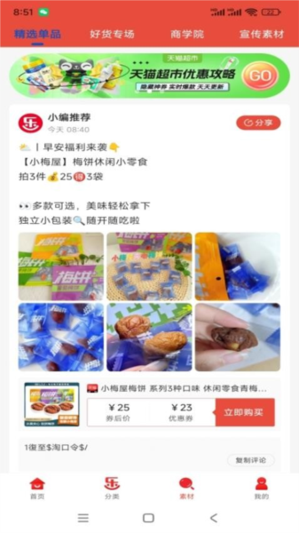 5、素材选择:用户可自行选择优质商品素材进行分享,分享成功可获得相应福利;