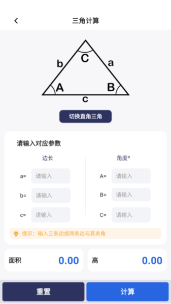 例如三角计算界面,输入相关参数后软件会自动计算出结果。