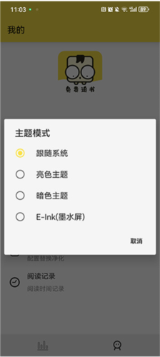 在个人中心选择“主题模式”,可以在跟随系统、亮色、暗色、墨水屏四种显示主题中进行切换。