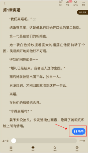1、在免费追书的小说阅读界面,点击屏幕中央,工具栏中会出现“听书”图标。
