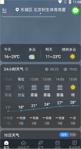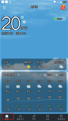 1、打开应用程序进入首页,可查看当前逐小时天气情况;