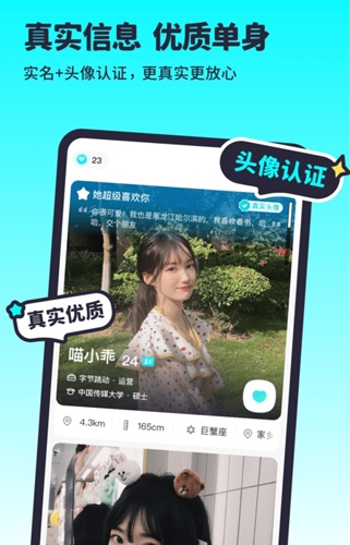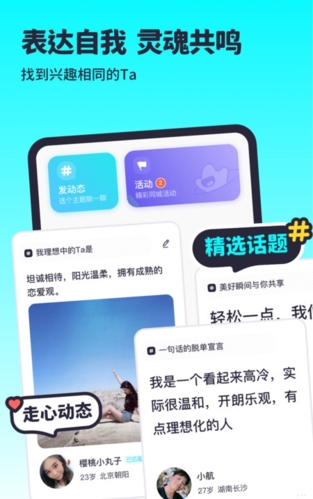 1. 这是一个单身社区应用,设有多种流行主题与互动玩法,支持实名认证与安心交流;