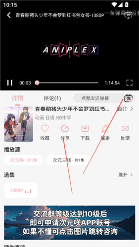 4.进入具体的番剧播放页面,用户可以将内容分享给好友,也能发送弹幕与其他观众实时互动。