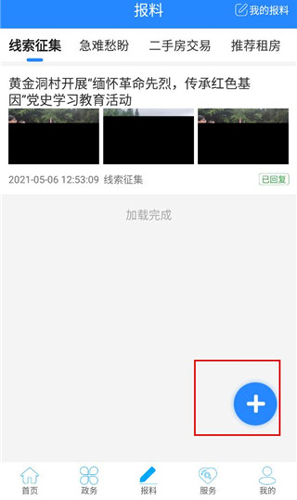 1、下载安装云上咸丰最新版,打开首页后点击【报料】。