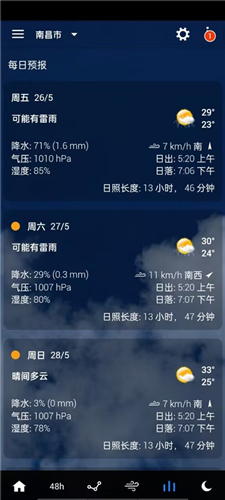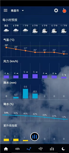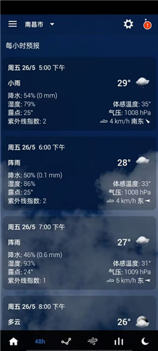 3、点击48小时板块,能够查阅未来两天内每小时的天气变化;