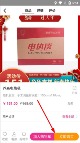 3、点击进入具体商品详情页,查看商品名称、价格、用户评价等信息,可以收藏商品或联系客服,点击加入购物车或立即购买按钮。