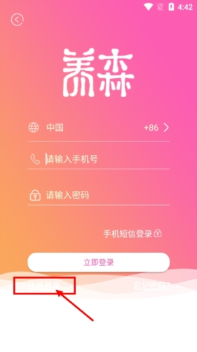 由于未登录,系统会显示登录界面,在页面左下角可以找到“注册”入口,该入口颜色较浅,已用方框标出。