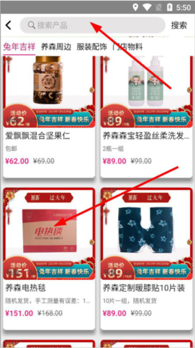 2、进入购物页面后,可以看到新年新品、养森周边、服装配饰、门店物料等分类,用户既可通过搜索框直接查找商品,也可浏览并选择所需产品。