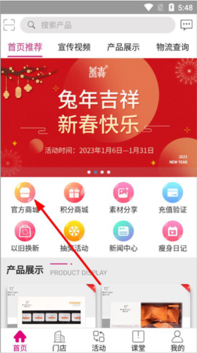 1、打开养森应用并登录,首页会展示推荐产品、宣传视频、物流查询、官方商城、积分商城、素材中心及新闻等模块,点击进入官方商城。