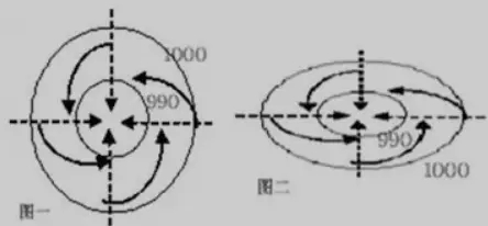 2、利用气旋与反气旋图:例如在北半球气旋中,不同方位风向不同;南方多为偏西风,北方多为偏东风;西侧多为偏北风,东侧多为偏南风。