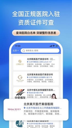 本软件提供全国数万家正规医院的医美价格查询、机构医生清单查询、资质查验、设备真伪验证、项目优惠查询、真实案例查看及个性化方案定制等功能;