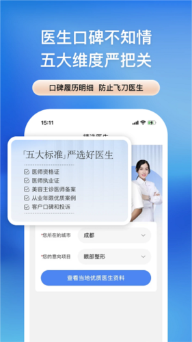 从医生资格、美容主诊资格、执业医师证、从业经验、用户口碑五个方面综合评估,合格者才展示项目报价;同时可查阅医生清单,避开不合格人选;