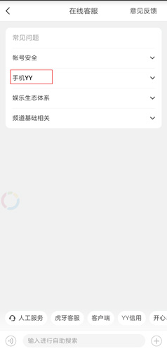 2、选择“手机YY”相关帮助,并点击“手机YY上能否创建频道”问题。