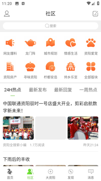 2、社区页面包含网友爆料、龙门阵等互动板块,细分城市规划、情感生活等内容分类;24H热点呈现本地新鲜事,方便居民交流分享身边动态。