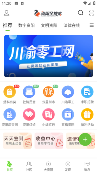 1、首页设有推荐、数字资阳等标签,展示川渝零工网等信息;提供爆料有奖、求职招聘、资阳房交网等功能入口,集中本地资讯与服务。