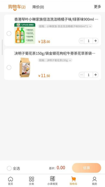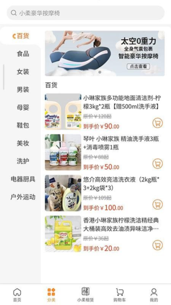 4.按分类查找商品信息,选中后加入购物车并完成支付结算;