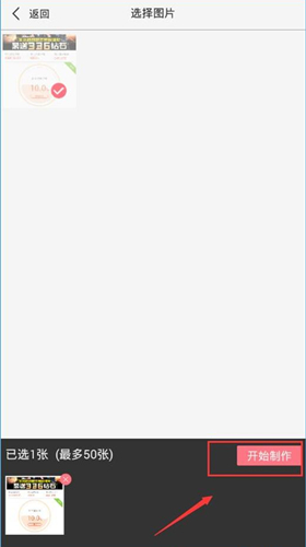 3、点击批量水印,从手机相册中选择需要处理的照片,然后点击开始制作按钮;
