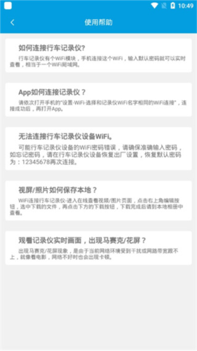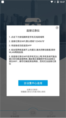 2. 点击界面下方按钮跳转至手机无线设置,选择记录仪WiFi网络并连接,初始密码一般为12345678。
