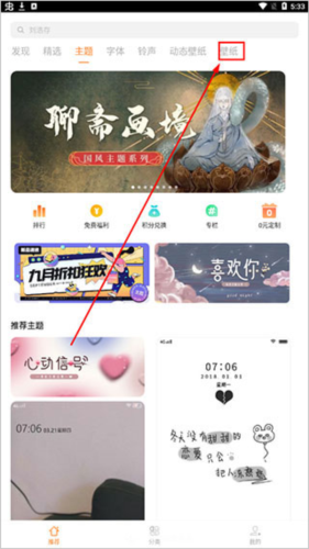 1、安装并打开i主题应用,在首页上方选择壁纸栏目;