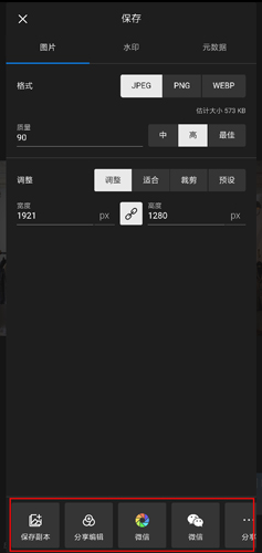 2、在保存设置中,选择图片格式、是否添加水印、是否保留元数据等选项,最后将图片保存至本地或直接分享。