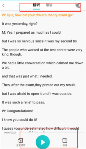 3、用户可选用精听或跟读模式;精听模式下可调整播放速度,点击全文播放开始学习。